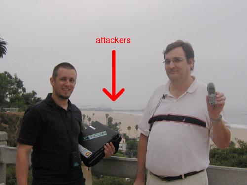 The long-distance-snarf is an experiment that took place in the early morning of 4th August 2004 at the Santa Monica Pier in California. Five people (John Hering, James Burgess, Kevin Mahaffey, Mike Outmesguine and Martin Herfurt) made it out of their beds and met a crew of the TV station G4TechTV.